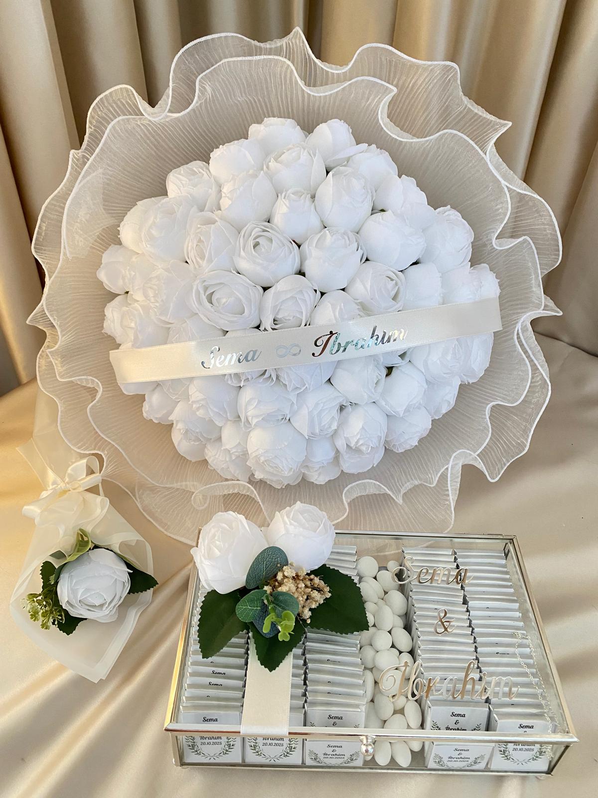 55 adet şakayıkla hazırlanmış tüllü buket,