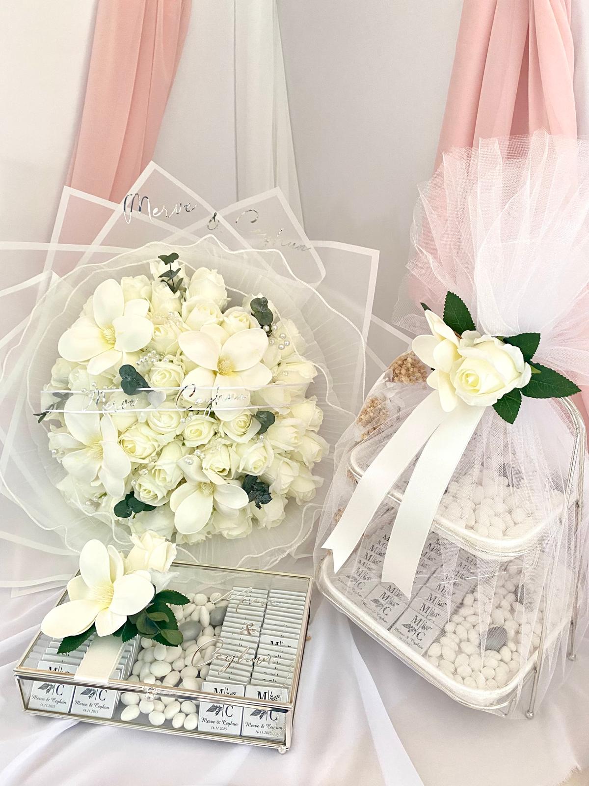 Beyaz gül ve manolyalarla dizayn edilmiş buket