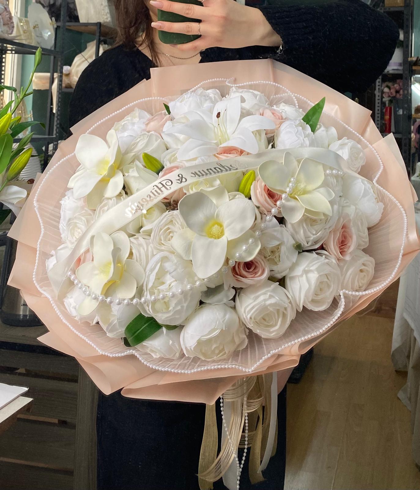 Trendin soft renkleriyle şakayık gül ve manolya ile hazırlanmıştır