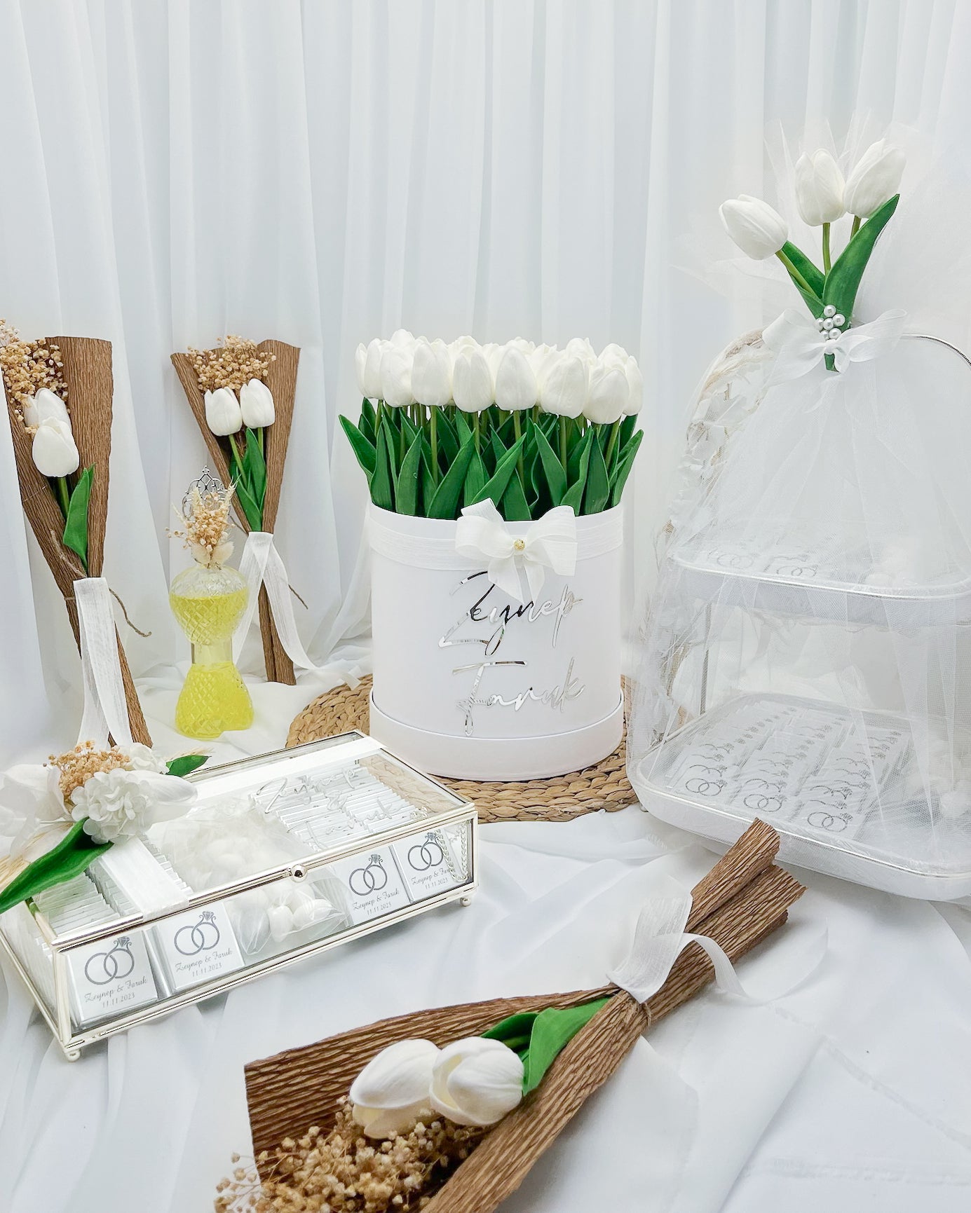 Not: Anne buketleri ve incili kurdele fiyata dahil değildir. "Çiçek & Çikolata" ve "Söz Kesim Seti" menülerinden ekleyebilirsiniz.