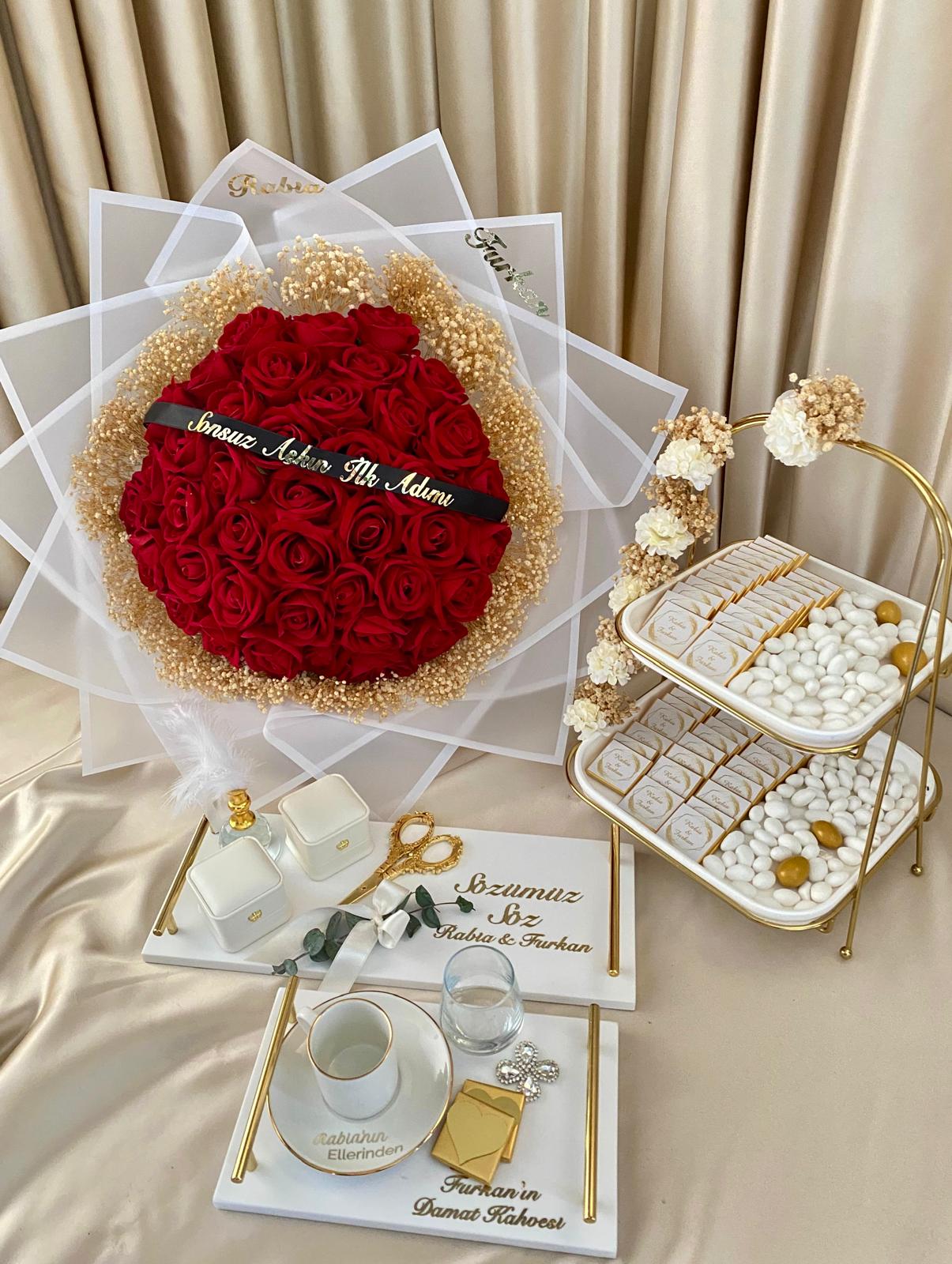 (Roleks deri yüzüklük & Makas & Damat kahvesi fincanı & Kahveyanı su bardağı &tüylük