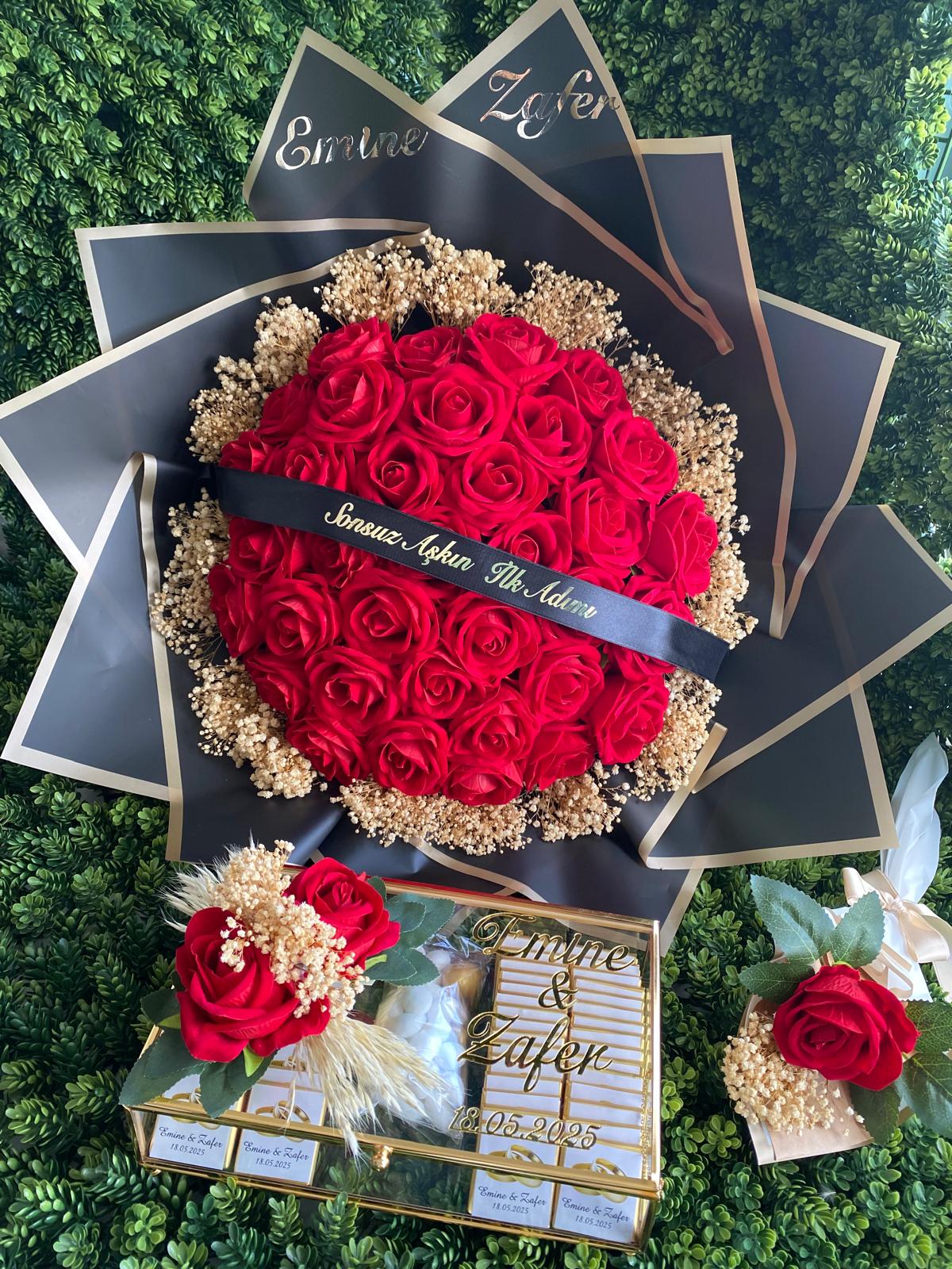 - 41 adetli kadife gül bulunan özelleştirilmiş siyah kurdelalı çiçek buketi